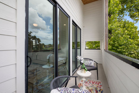 Privacy balcony offers natural light in primary suite and driveway visuals.